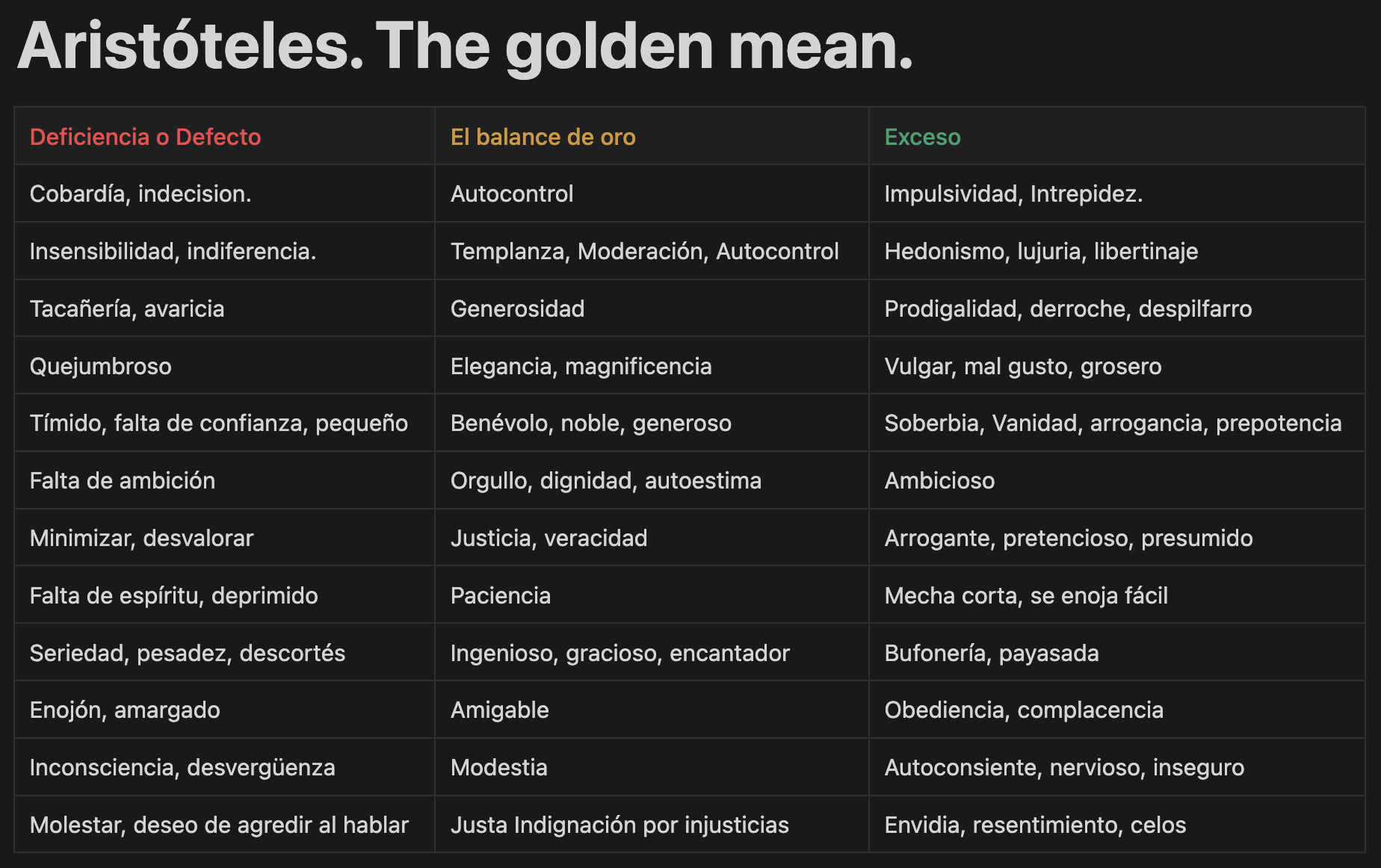 Las siguientes cualidades de carácter pueden ser organizadas en tríadas, en donde las primeras y las últimas cualidades siempre serán extremos y vicios, y la cualidad de en medio es considerada una virtud o excelencia.