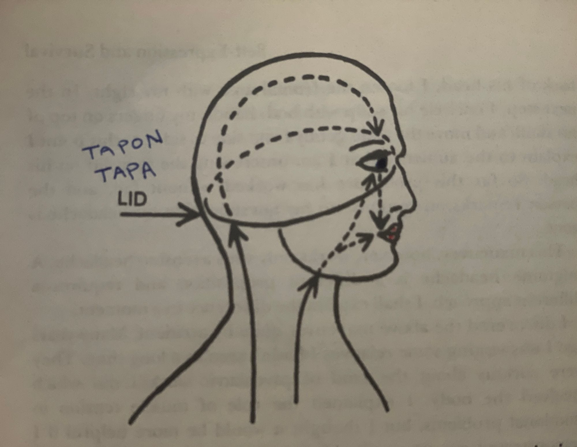 (Imagen "A") Este flujo de energía carga con el componente agresivo de esas emociones. Dicho componente es necesario en tales acciones como el revelarse, hablar la verdad y el ver con atención. Si bloqueamos nuestra agresión y nuestra auto expresión, la presión se acumula. Creando un dolor de cabeza.